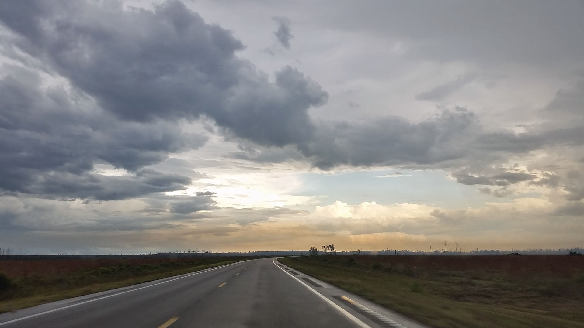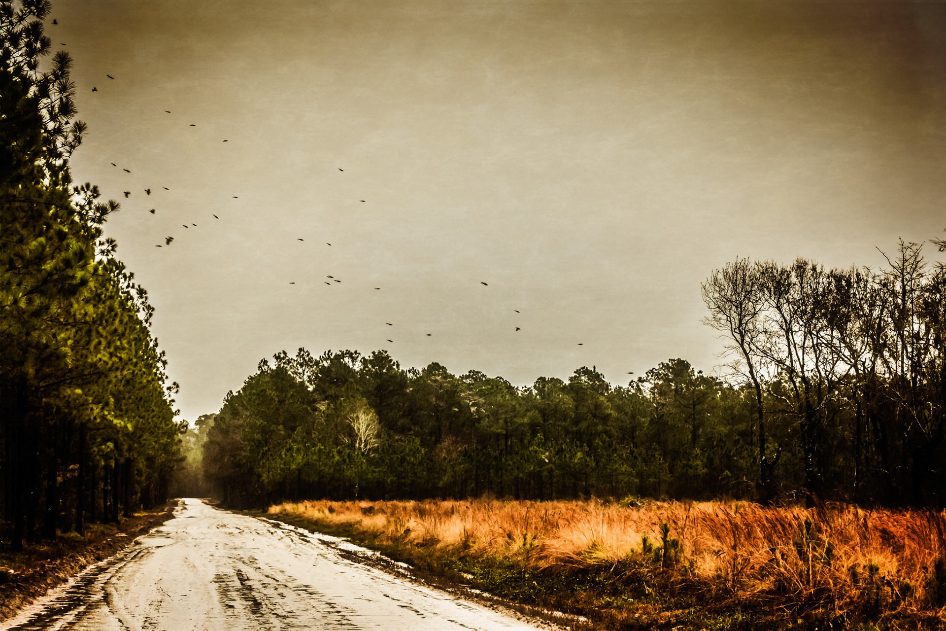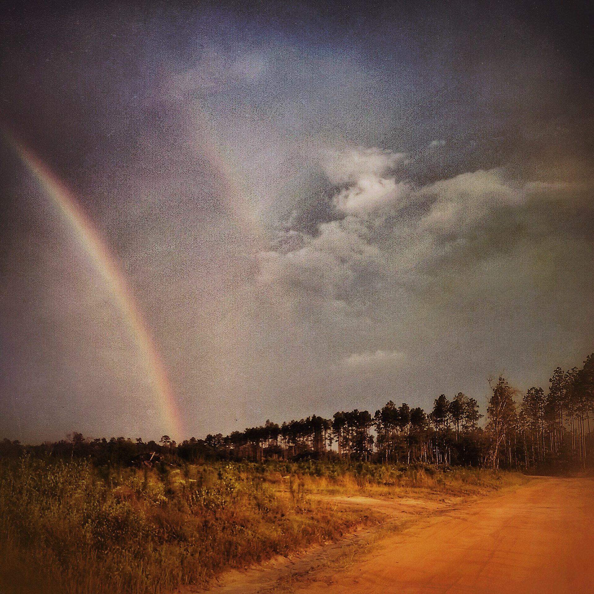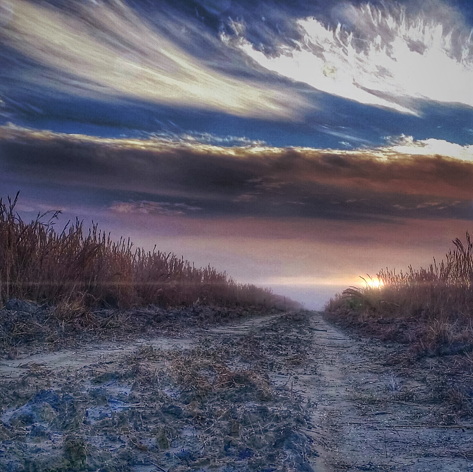 Back lit clouds down a dirt road